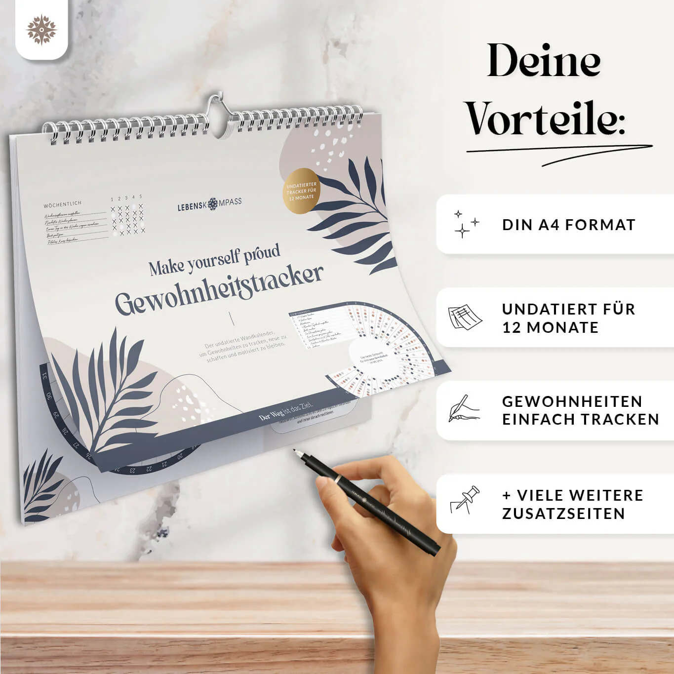 - Nützliche Zusatzseiten wie Stimmungstracker, Jahrestracker und Ideen für neue Gewohnheiten